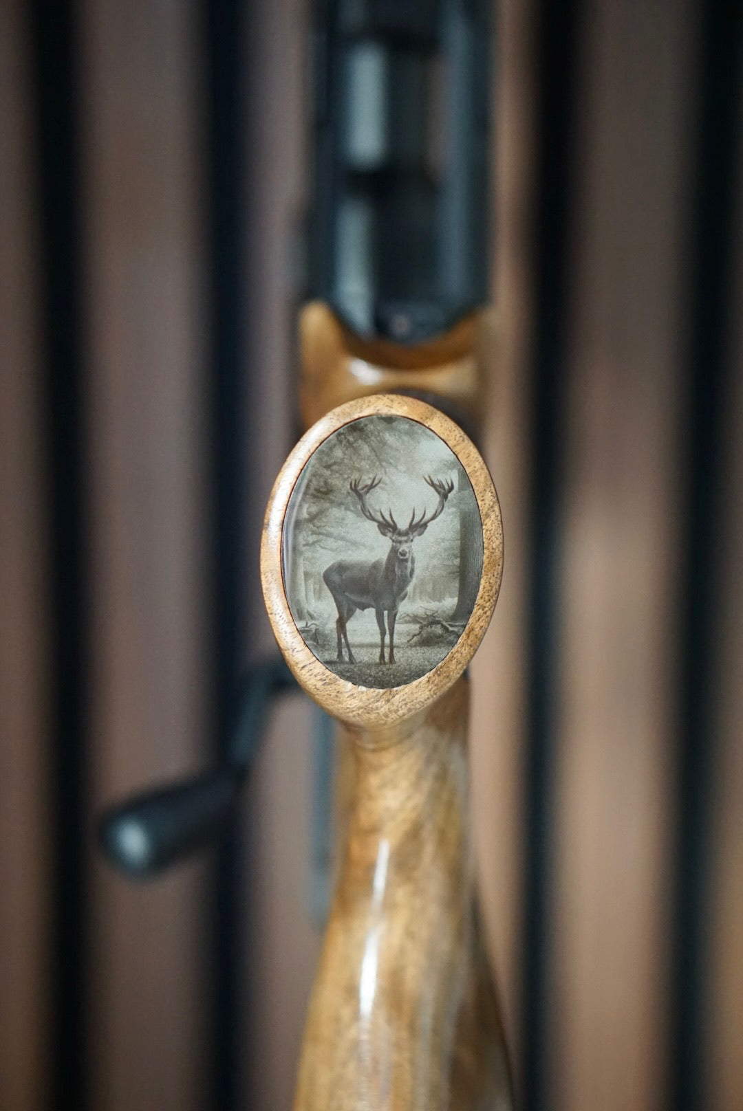 Ge ditt vapen en exklusiv och personlig detalj med en pistolgreppsrosett i rostfritt stål, graverad med ett detaljerat motiv av kronhjort.