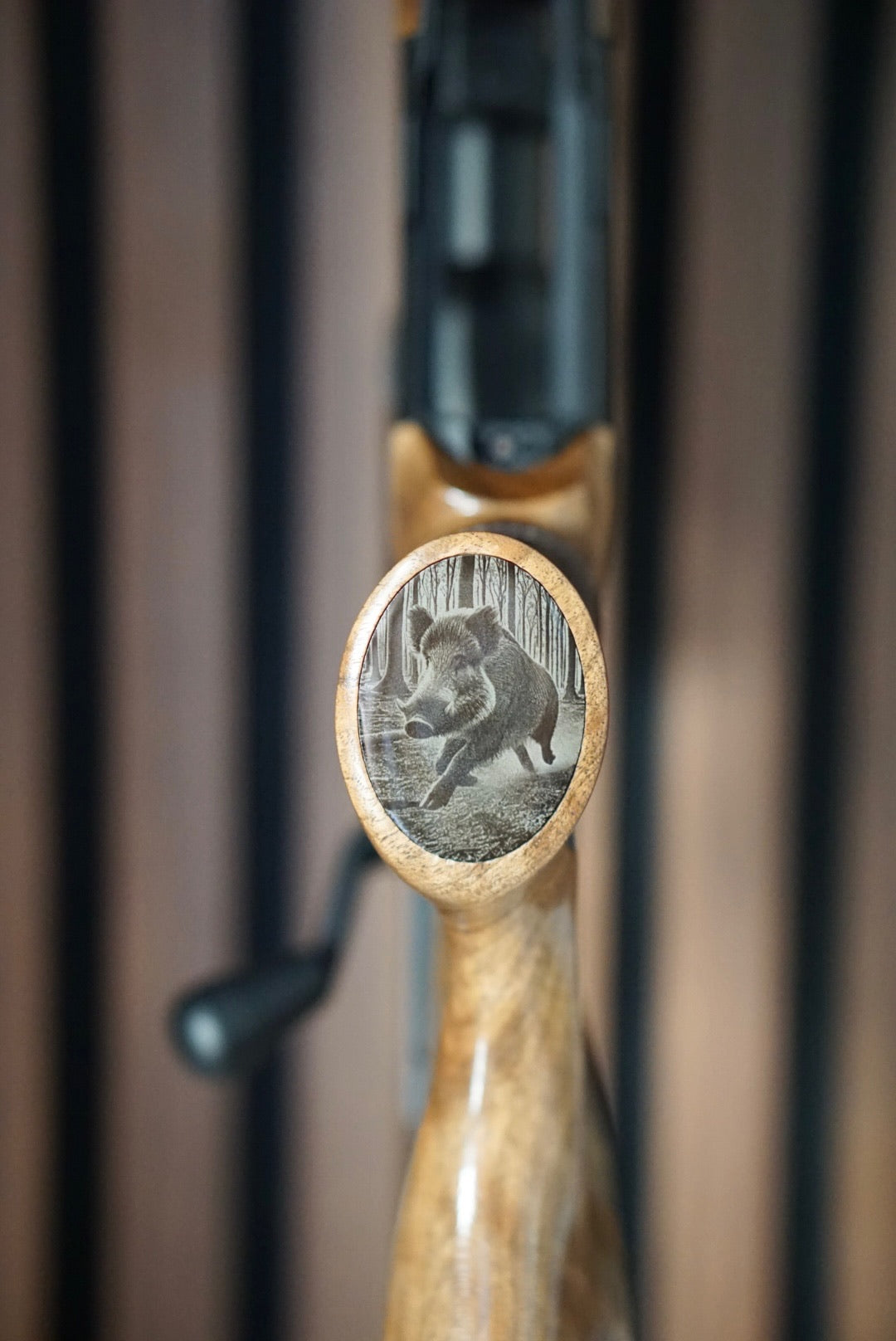 Ge ditt vapen en unik och exklusiv detalj med en pistolgreppsrosett i rostfritt stål, graverad med ett kraftfullt vildsvinsmotiv.